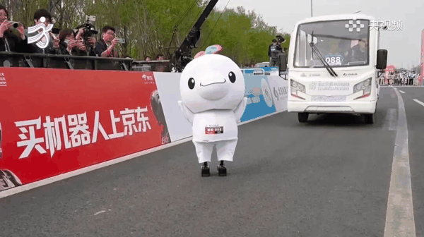 由于是间隔出发,前面的机器人已经跑完,后面的队伍还没发车。中段出现了一台小鼻嘎机器人,手里还拿着奶瓶,主打一个萌系赛道。话说身高这么矮的机器人,到了终点真能够得到撞线的那根线吗。