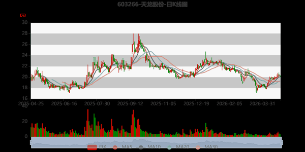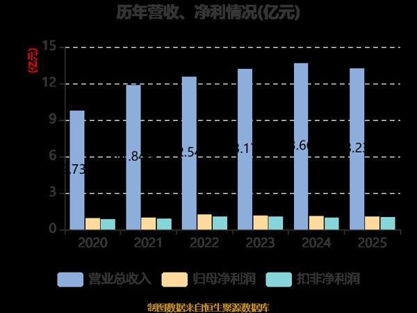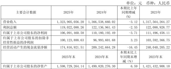 中证智能财讯 天龙股份 (603266)4月25日披露2025年年度报告。2025年,公司实现营业总收入13.24亿元,同比下降3.12%;归母净利润1.06亿元,同比下降3.71%;扣非净利润1亿元,同比增长3.23%;经营活动产生的现金流量净额为1.75亿元,同比下降16.45%;报告期内, 天龙股份 基本每股收益为0.53元,加权平均净资产收益率为6.84%。公司2025年度分配预案为:拟向全体股东每10股派现1.2元(含税)。