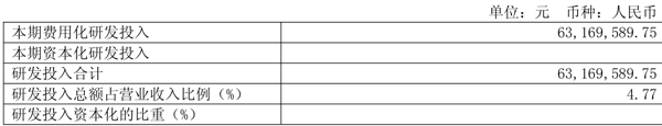 2025年全年,公司研发投入金额为6316.96万元,同比下降2.08%;研发投入占营业收入比例为4.77%,相比上年同期上升0.05个百分点。