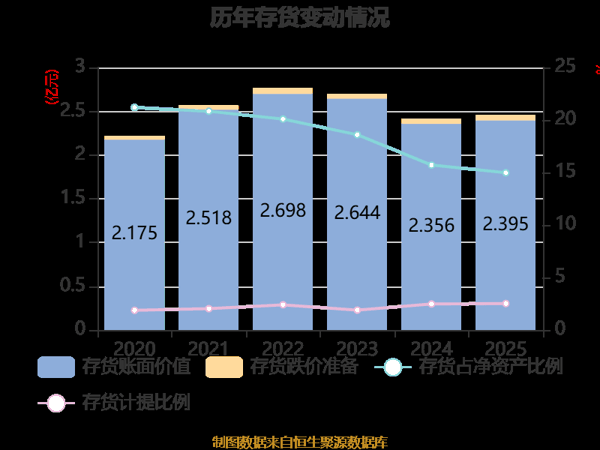 从存货变动来看,截至2025年末,公司存货账面价值为2.39亿元,占净资产的14.98%,较上年末增加388.31万元。其中,存货跌价准备为620.23万元,计提比例为2.52%。