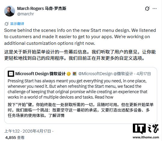 “一些关于新版开始菜单设计的幕后消息。我们听取了用户反馈,让打开应用变得更便捷。”马奇 · 罗杰斯在 X 上写道,“我们目前正在开发更多自定义选项。”