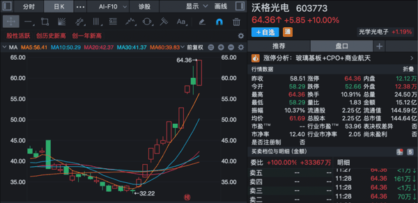 消费电子 概念股早间强势上攻,板块指数一度放量大涨逾3%,创年内新高。 沃格光电 (603773)涨停,近10个交易日走出6个涨停板,4月以来累计飙升96.46%; 晶赛科技 、 协创数据 、 三安光电 等亦涨停或涨超10%。