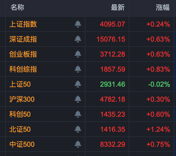 今日早盘,A股小幅震荡上扬,创业板指突破3700点,再创近11年新高,深证成指也站稳15000点,再创4年半新高,上证指数、科创综指、北证50等飘红,成交保持平稳。