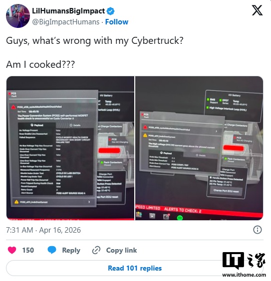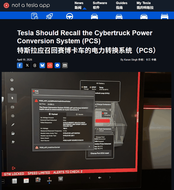 IT之家 4 月 20 日消息,据 not a tesla app 报道,特斯拉 Cybertruck 车主正面临愈发严重的硬件问题,导致大量车主无法在家为车辆充电。该车的功率转换系统(PCS)出现大面积故障,已成为一大棘手难题,不仅让车辆交流充电功能彻底失效,还让车主面临高昂的脱保维修费用风险。该媒体称,特斯拉应召回 PCS 系统。
