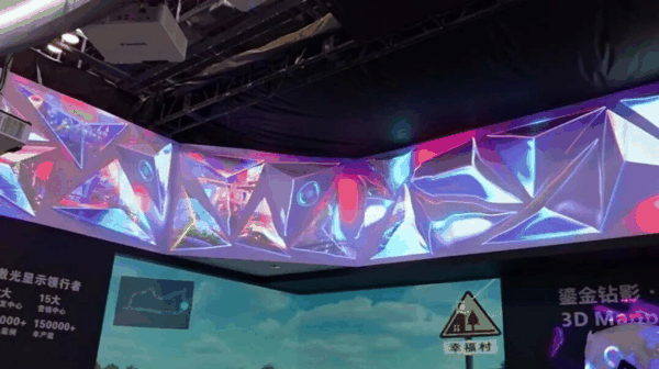 由多台7000流明的新款EL Pro双百系列投影机协同作业,在钻石立体墙面完成无缝环绕投影。该系列依托视美乐独创C.Bright技术体系中的Bright+亮彩技术,成为行业首款实现 100% 色亮与 100% 亮度实标的 DLP 投影机,具有里程碑式的独特意义。立体的钻石棱面在展厅超强的环境光下依然折射出璀璨光影,虚实交织,美轮美奂。