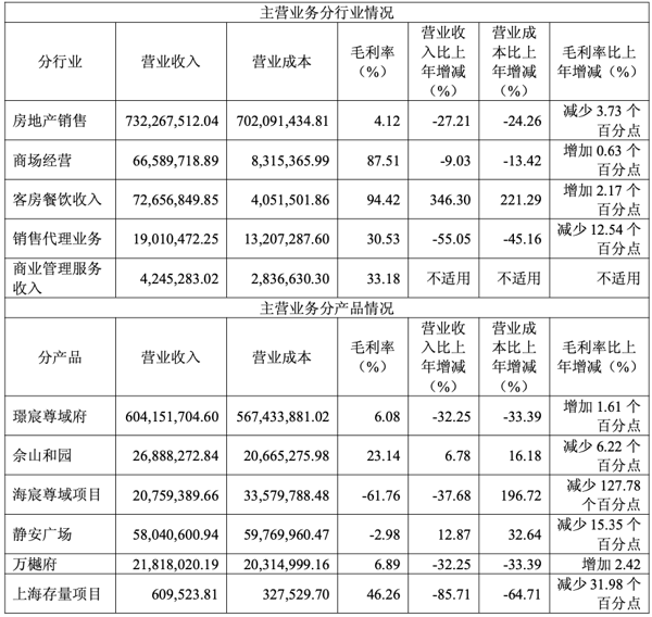 报告期内,公司实现房地产销售收入7.32亿元,较上年同比减少27.21%,毛利率4.12%,同比减少3.73个百分点。公司实现商场经营收入6658.97万元,同比减少9.03%,毛利率87.51%。 酒店 客房 餐饮 收入7265.68万元,同比增加346.30%,毛利率94.42%。