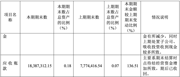 截至报告期末,公司应收账款18,387,312.15元,同比增加136.51%,主要系期末结算时点待结经营资金增加所致,期后已收回。