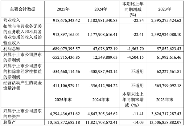 4月10日, 西藏城投 (600773)披露2025年年度报告。 2025年,公司实现营业总收入9.19亿元,同比下降22.34%;归母净利润亏损5.53亿元,上年同期盈利1254.99万元; 扣非净利润亏损5.55亿元,上年同期亏损3.09亿元;经营活动产生的现金流量净额为-4.11亿元,上年同期为-3.56亿元;报告期内, 西藏城投 基本每股收益为-0.58元,加权平均净资产收益率为-12.09%。
