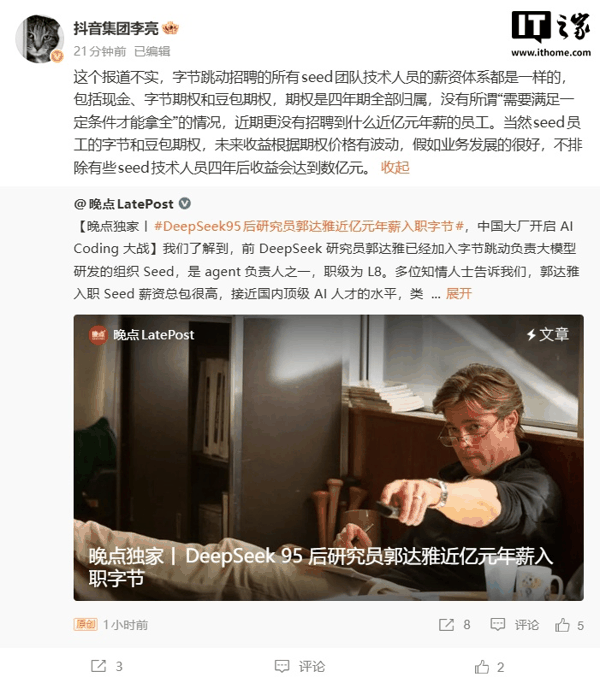 IT之家 4 月 16 日消息,针对 DeepSeek 95 后研究员郭达雅近亿元年薪入职字节的报道,抖音集团副总裁李亮今晚在社交平台发文表示,“这个报道不实”。