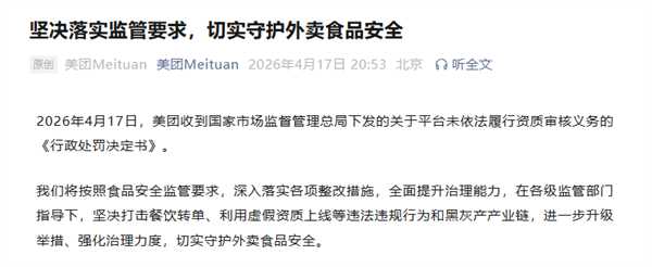 快科技4月17日消息,美团今日发文表示, 已于当日收到国家市场监督管理总局下发的关于平台未依法履行资质审核义务的《行政处罚决定书》。