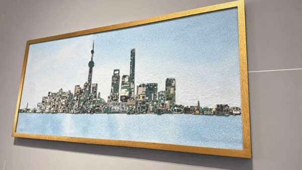 华勤技术展厅由主板零件拼接的 陆家嘴 江景图。