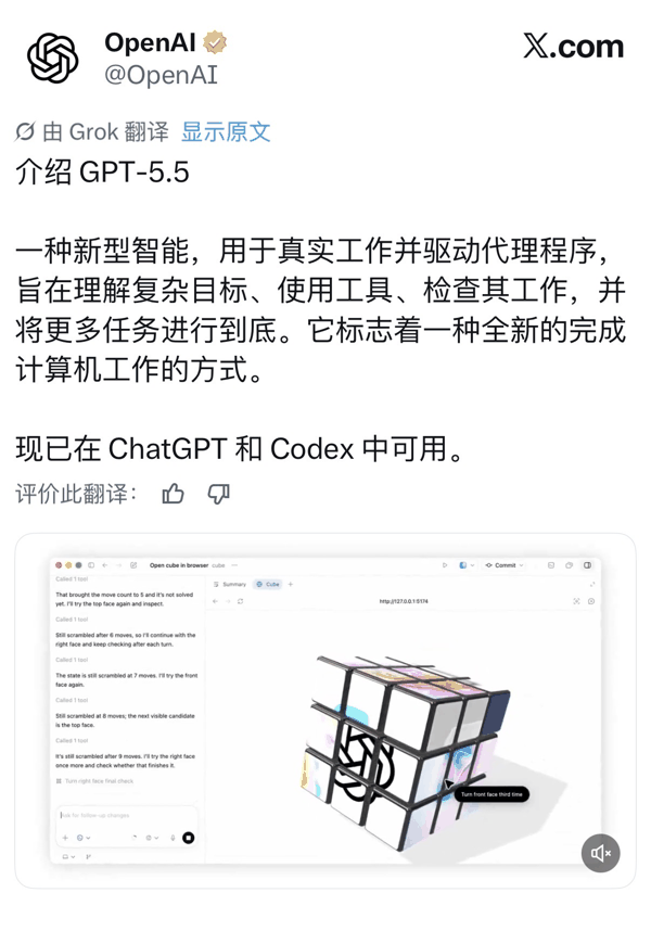 官方表示,GPT-5.5擅长编写和调试代码、在线搜索、分析数据、创建文档和 电子 表格、操作软件,以及在不同工具间灵活切换完成任务。用户无需管理每个步骤,只需将复杂且包含多个部分的任务交给 GPT-5.5,然后它就能自行规划、使用工具、检查工作、应对各种不确定性并持续推进。
