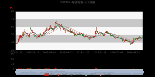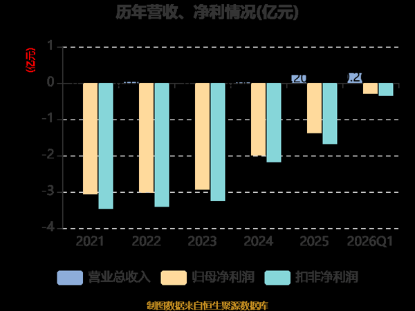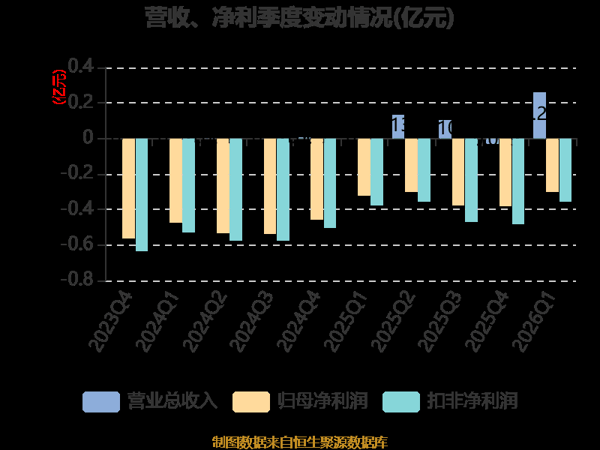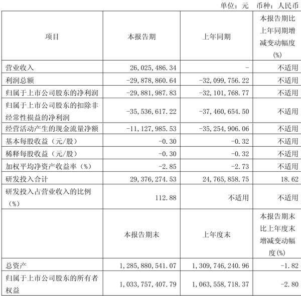 中证智能财讯海创药业(688302)4月25日披露2026年第一季度报告。公司实现营业总收入2602.55万元;归母净利润亏损2988.2万元,上年同期亏损3210.18万元;扣非净利润亏损3553.66万元,上年同期亏损3746.07万元;经营活动产生的现金流量净额为-1112.8万元,上年同期为-3525.49万元;报告期内,海创药业基本每股收益为-0.3元,加权平均净资产收益率为-2.85%。