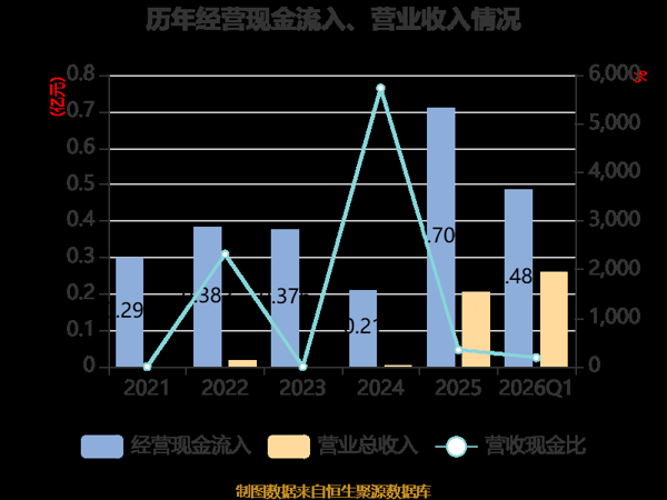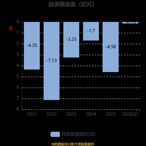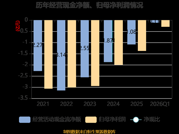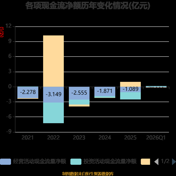截至2026年一季度末,公司经营活动现金流净额为-1112.8万元,同比增加2412.69万元;筹资活动现金流净额-160.76万元,同比减少38.75万元;投资活动现金流净额1317.79万元,上年同期为-3.79亿元。