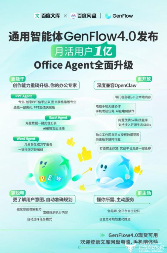 4月27日,在百度AI Day开放日上,百度文库网盘联合发布通用智能体「GenFlow4.0」,全面升级Office Agent,个人和团队均可在网盘通用智能体GenFlow4.0中一键部署OpenClaw,把文库网盘打造成自己的「AI工作台」。