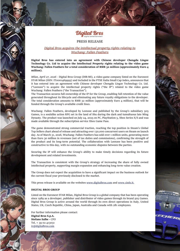 根据 Digital Bros 官方公告,此次交易使集团获得了对《明末:渊虚之羽》IP 的完全所有权,能够在游戏整个生命周期内完整保留其创造的价值,并免除未来向开发商支付任何版税的义务。收购资金将通过集团现有信贷额度提供。