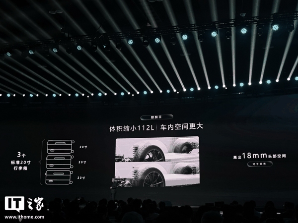 电池体积缩小,也将为车辆的车内空间带来正面影响:体积缩小 112L,相当于 3 个标准 20 寸行李箱,乘客也将多出 18mm 高的头部空间。