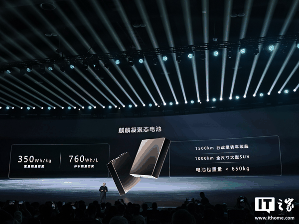 同场发布的麒麟凝聚态电池,具备 350Wh/kg 重量能量密度、760Wh/L 体积能量密度 ,电池包重量小于 650kg,行政级轿车续航达到 1500km,全尺寸大型 SUV 续航达到 1000km。