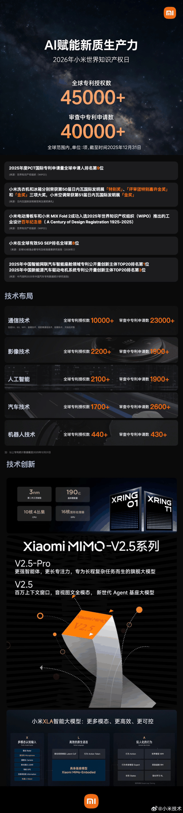 IT之家 4 月 26 日消息,今天是 2026 年世界知识产权日。小米技术官方微博分享了小米的技术创新与知识产权成果: 截至 2025 年底,小米集团全球授权专利数已超 4.5 万项 。