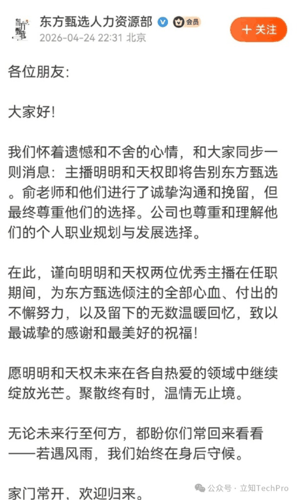 4月24日, 东方甄选 人力资源部在社区发文:“我们怀着遗憾和不舍的心情,和大家同步一则消息:主播明明和天权即将告别 东方甄选 。俞老师和他们进行了诚挚沟通和挽留,但最终尊重他们的选择。”