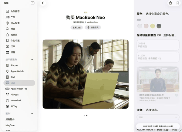 4 月 14 日,界面新闻查询苹果官方 App store 获悉, MacBook Neo 每位顾客限购 2 台,目前因售罄暂时不能订购。以 8G+256G 为例,售价 4599 元,苹果线上官方商店提供免息分期服务,如果分期 24 期,每月仅需支付 192 元。