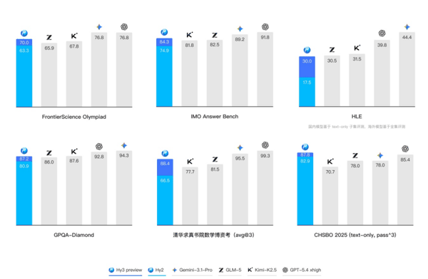 复杂推理能力方面,Hy3 preview在FrontierScience-Olympiad(专家级科学推理)和IMOAnswerBench(数学推理)基准测试中得分超过Kimi-K2.5和GLM-5,低于两个海外模型。在GPQA Diamond(博士级科学问题)基准测试中,Hy3 preview得分超过Kimi-K2.5,低于其他三个模型。在全国中学生生物学联赛(CHSBO 2025)中,Hy3 preview得分最高。