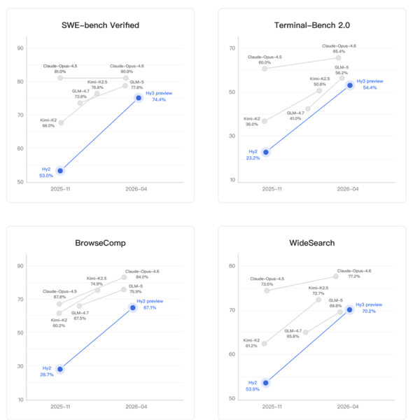 代码与智能体能力方面,Hy3 preview在SWE-Bench Verified(解决现实世界软件问题)、Terminal-Bench 2.0(智能体端到端执行)、BrowseComp(互联网上定位关联信息)基准测试中,得分都低于Claude-Opus-4.6和GLM-5,Terminal-Bench 2.0得分超过Kimi-K2.5。Hy3 preview在WildClawBench(智能体真实落地能力)、Claw Eval(真实世界任务中的智能体能力)测试中的得分超过Kimi-K2.5,低于GLM-5和Claude-Opus-4.6。在针对真实开发场景表现的混元内部测评集中,Hy3 preview得分超过Kimi-K2.5。