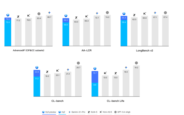 上下文学习和指令遵循能力方面,Hy3 preview在AdvancedIF(复杂指令遵循)和AALCR(长上下文推理)基准测试中得分低于Gemini-3.1-Pro、GPT-5.4 xhigh,但超过Kimi-K2.5和GLM-5,Long Bench v2(长上下文推理)测试得分高于Kimi-2.5。在腾讯混元提出的两个针对上下文学习能力的CL-bench和CL-bench-Life基准测试中,Hy3 preview得分低于两个海外模型,但高于Kimi-K2.5和GLM-5。