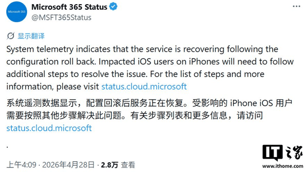 IT之家 4 月 28 日消息,微软官方账号 @MSFT365Status 今天(4 月 28 日)在 X 平台发布推文,确认其 Microsoft 365 部分服务出现故障, 影响使用 iOS 版 Outlook 应用的 iPhone 用户,用户可能遇到间歇性登录失败、“请求过多”错误或意外退出。