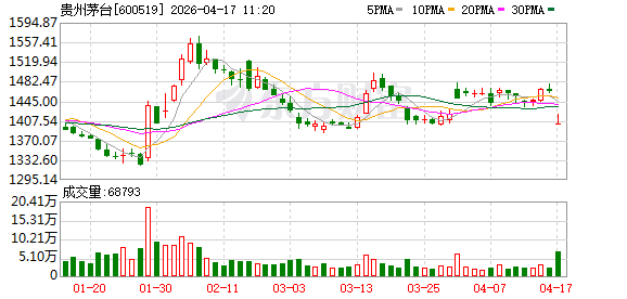 4月17日,茅台股价大幅低开,截至记者发稿时股价为1408元,下跌3.75%。