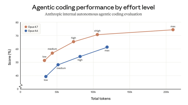 其次,Opus 4.7在较高“思考强度”下会进行更多推理,尤其是在智能体(agentic)场景的后续轮次中。这提升了其在复杂问题上的可靠性,但也意味着会生成更多的输出tokens。