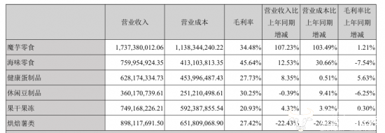 从产品来看,盐津铺子魔芋零食2025年收入由上年同期的8.38亿元增至17.37亿元,大幅增长了107.23%,毛利率同比提升1.21个百分点至34.48%,成为公司的第一大单品。而公司原核心品类烘焙薯类产品2025年实现收入8.98亿元,同比下降了22.43%,是公司六大系列产品中降幅最大的。