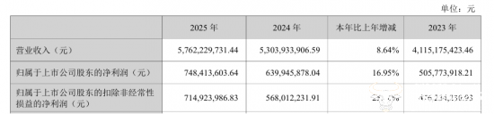 盐津铺子披露的2025年年报显示,公司全年实现营业收入57.62亿元,同比增长8.64%,归母净利润为7.48亿元,同比增长16.95%,营收和利润双双增长。