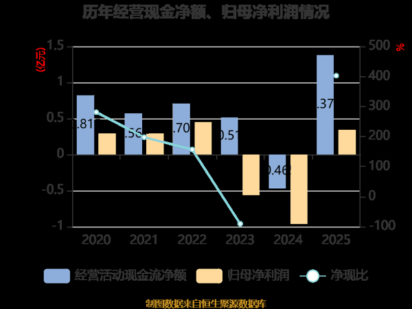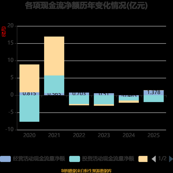 截至2025年,公司经营活动现金流净额为1.38亿元,同比增加1.84亿元;筹资活动现金流净额249.61万元,同比增加6177.41万元;投资活动现金流净额-2亿元,上年同期为-1.09亿元。