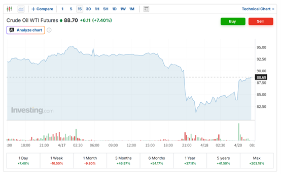 截至发稿,美油、布油双双涨超7%。西德克萨斯中质(WTI)原油 期货 价格上涨7.4%,报每桶88.7美元。布伦特原油 期货 价格上涨7.19%,报每桶96.88美元。 (WTI原油 期货 15分钟走势图来源:英为财情) (布伦特原油期货15分钟走势图来源:英为财情)