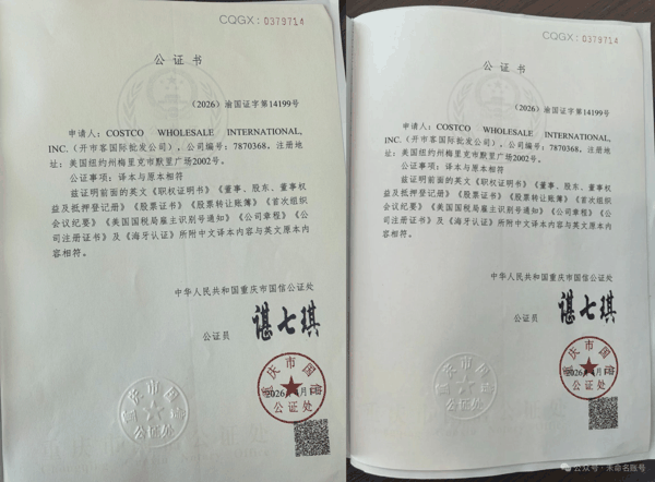 图片来源:成都日报公众号 时代财经发现,“开市客北京”于近日向时代财经提供的公证书、美国纽约州州务卿出具的公司文件认证副本(中英文各一份),与认证主体为“开市客商业(广东)股份有限公司重庆西南分公司”的公众号发布的文件内容一致。