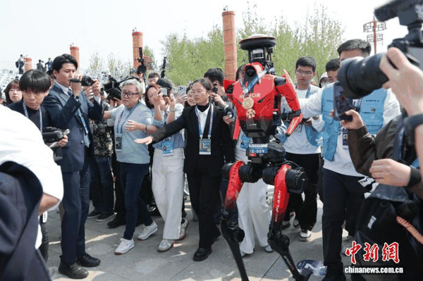 4月19日,2026北京亦庄半程马拉松暨人形机器人半程马拉松在北京举行。图为冠军团队准备接受媒体采访。 中新社 记者 杨郁然 摄