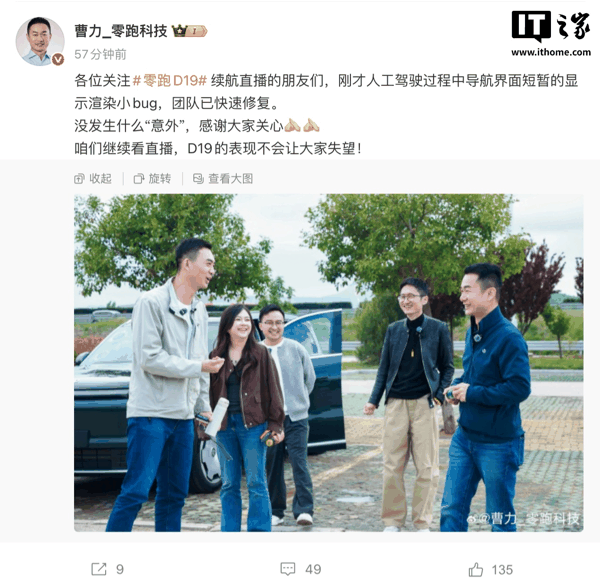 IT之家 4 月 22 日消息,今天下午,零跑科技高级副总裁曹力在微博发文称:“各位关注零跑 D19 续航直播的朋友们,刚才人工驾驶过程中导航界面 短暂的显示渲染小 bug,团队已快速修复 。没发生什么‘意外’,感谢大家关心。咱们继续看直播,D19 的表现不会让大家失望!”