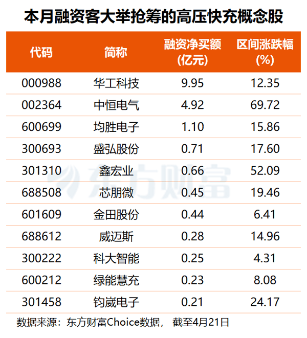 从资金角度看, 东方财富 Choice数据显示,本月共有17只高压快充概念股获得融资净买入, 华工科技 获融资客大举抢筹9.95亿元, 中恒电气 获杠杆资金加仓4.92亿元, 均胜电子 融资净买额达1.10亿元, 盛弘股份 、 鑫宏业 亦获约0.7亿元融资净买入。