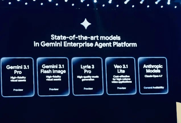 在模型层面,平台持续支持第三方模型接入,包括 Anthropic Claude Opus 4.7,并将所有 GCP 服务通过模型上下文协议(MCP)开放,让智能体可直接调用云资源。