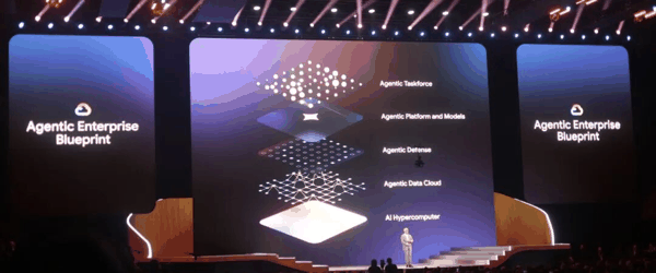Kurian 在台上把它拆成了五层架构: AI 超级计算机(AI Hypercomputer)、智能体数据云(Agentic Data Cloud)、智能体安全(Agentic Defense)、智能体平台与模型(Agent ic Platform and Models )、智能体编排小组(Agentic Taskforce)。