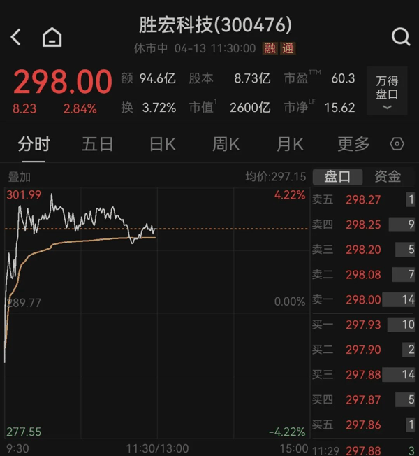 Wind数据显示,4月13日上午, 胜宏科技 A股收报298元/股,最新市值为2600亿元。