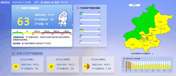 据北京市生态环境监测中心今早7时数据,目前实时空气质量指数63,空气质量良。