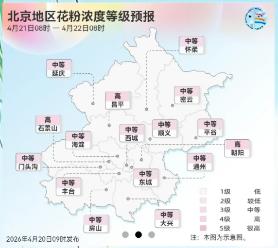 北京地区花粉浓度等级预报(4月21日8时至4月22日8时):