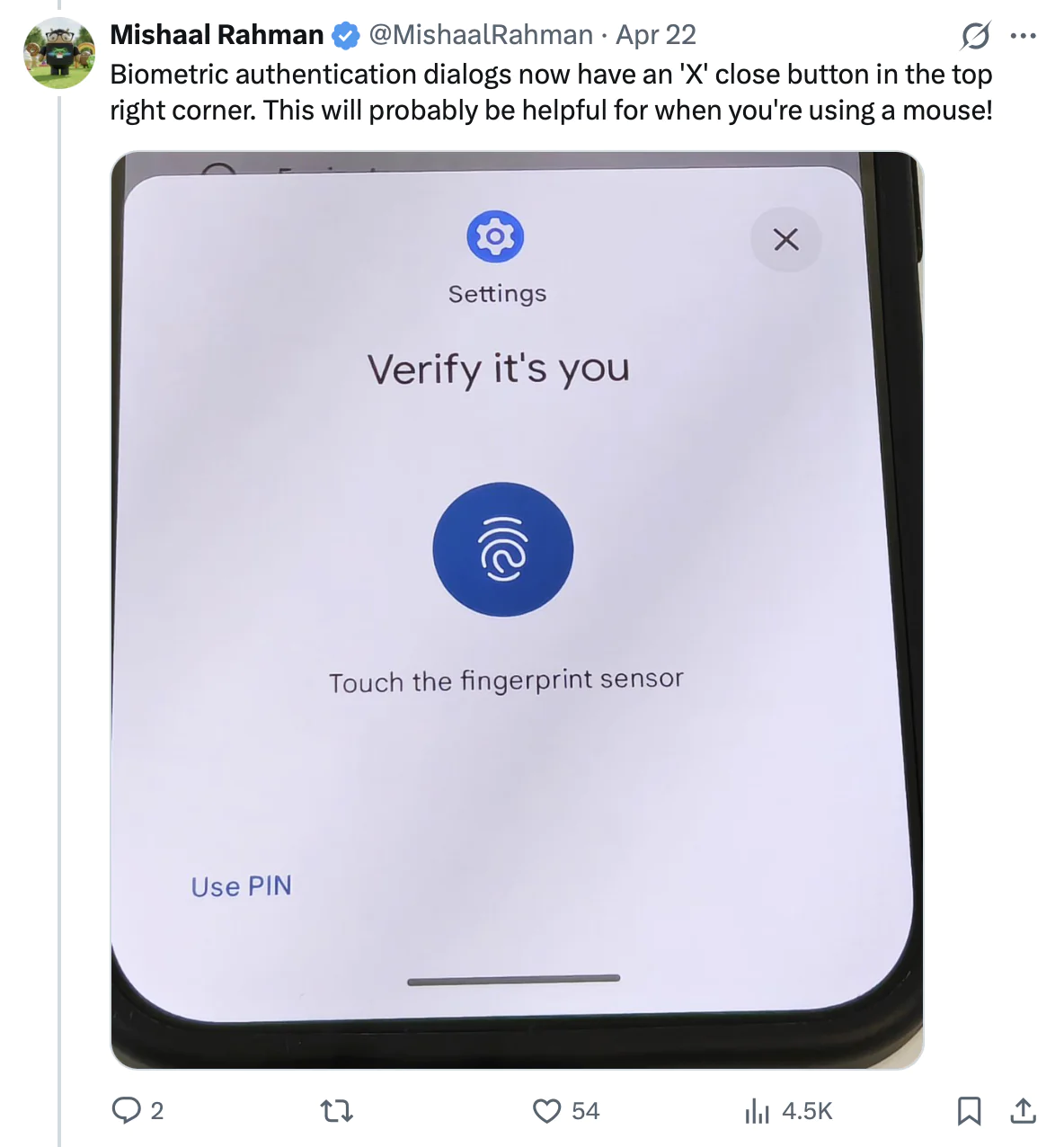 安卓 17 还优化生物识别对话框交互逻辑,新版本在对话框右上角新增了“X”关闭按钮,支持用户直接点击退出。目前用户需依赖安卓的通用返回手势关闭此类窗口,而明确的“X”按钮为鼠标和键盘用户提供了更直观的退出路径。