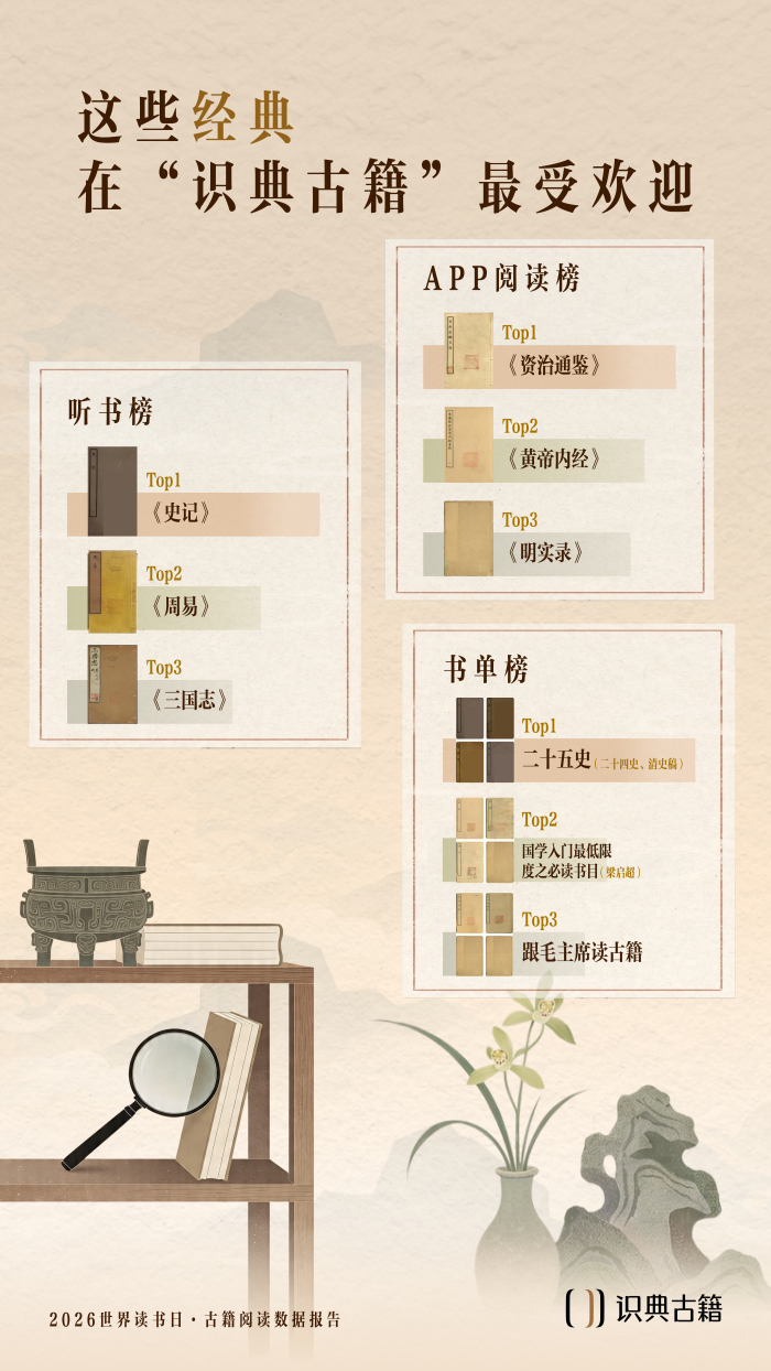 4月23日,第31个世界读书日之际,“识典古籍”发布《古籍阅读数据报告》。数据显示,过去一年“识典古籍”月均读者人数超240万人,《资治通鉴》《史记》等经典古籍最受用户欢迎。当前,“识典古籍”已免费公开近6万部古籍,推动古籍阅读从专业研究场景走向大众日常阅读,也让更多公众得以参与古籍整理与文化传承。