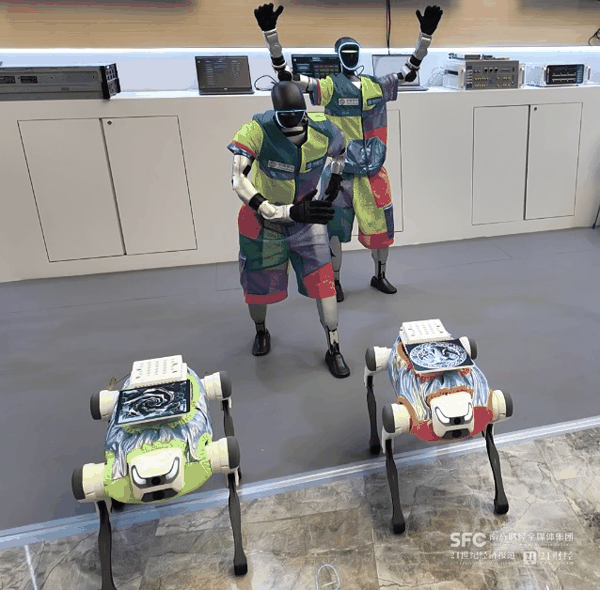 大会现场,2台 人形机器人 、2台机器狗秀出群舞。表演伊始,两台人形 机器人 率先举起双臂欢呼。紧接着,其中一台人形 机器人 优雅地做出“请”的邀请起舞姿态。仿佛听懂了默契的暗号,两只机器狗随之灵动响应,它们踏着节拍,一个接一个地跃动、起跳——不同构型的机器人通过6G网络实现精准的时序配合,完成了一组充满科技感与节奏感的跨界群舞。