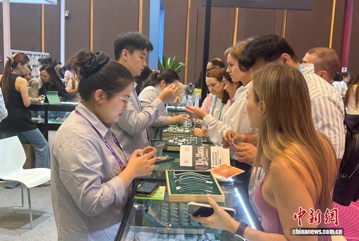 4月26日,在第139届广交会第二期时尚饰品专区,境外采购商正在了解中国企业展出的饰品。 中新社 记者 程景伟 摄