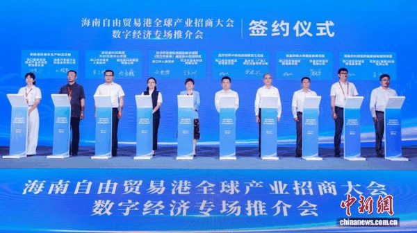 4月14日,海南自由贸易港全球产业招商大会数字经济专场推介会在海口举办,图为签约仪式。 中新网 记者 王子谦 摄