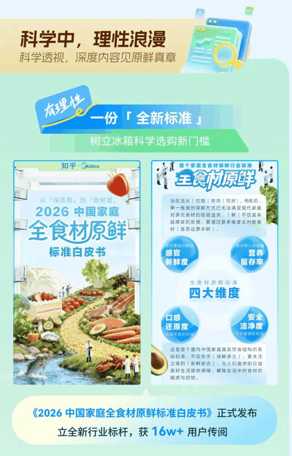 美的联合知乎发布了《2026中国家庭全食材原鲜标准白皮书》,把“原鲜”拆成感官新鲜度、营养留存率、口感还原度、安全洁净度四个维度。